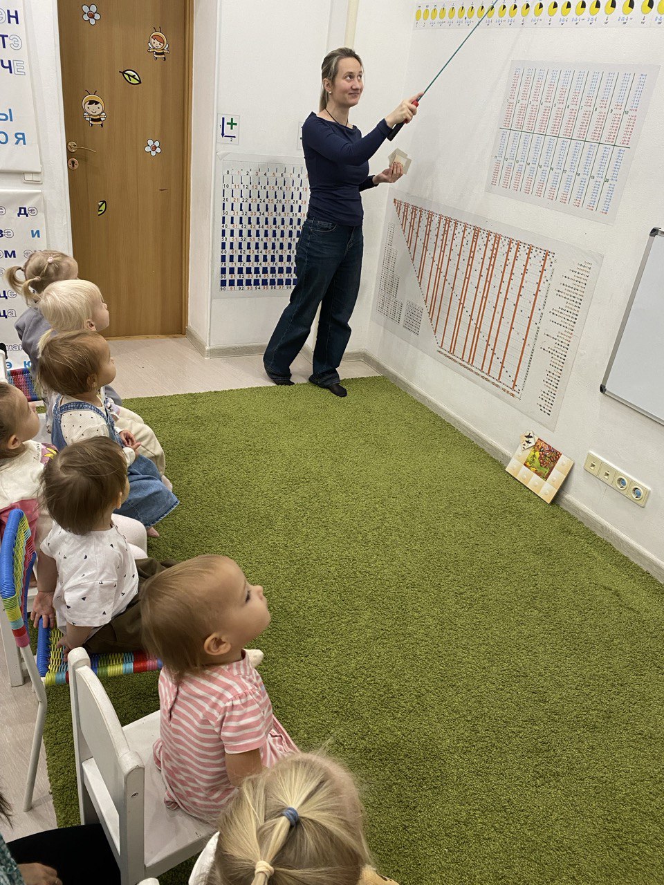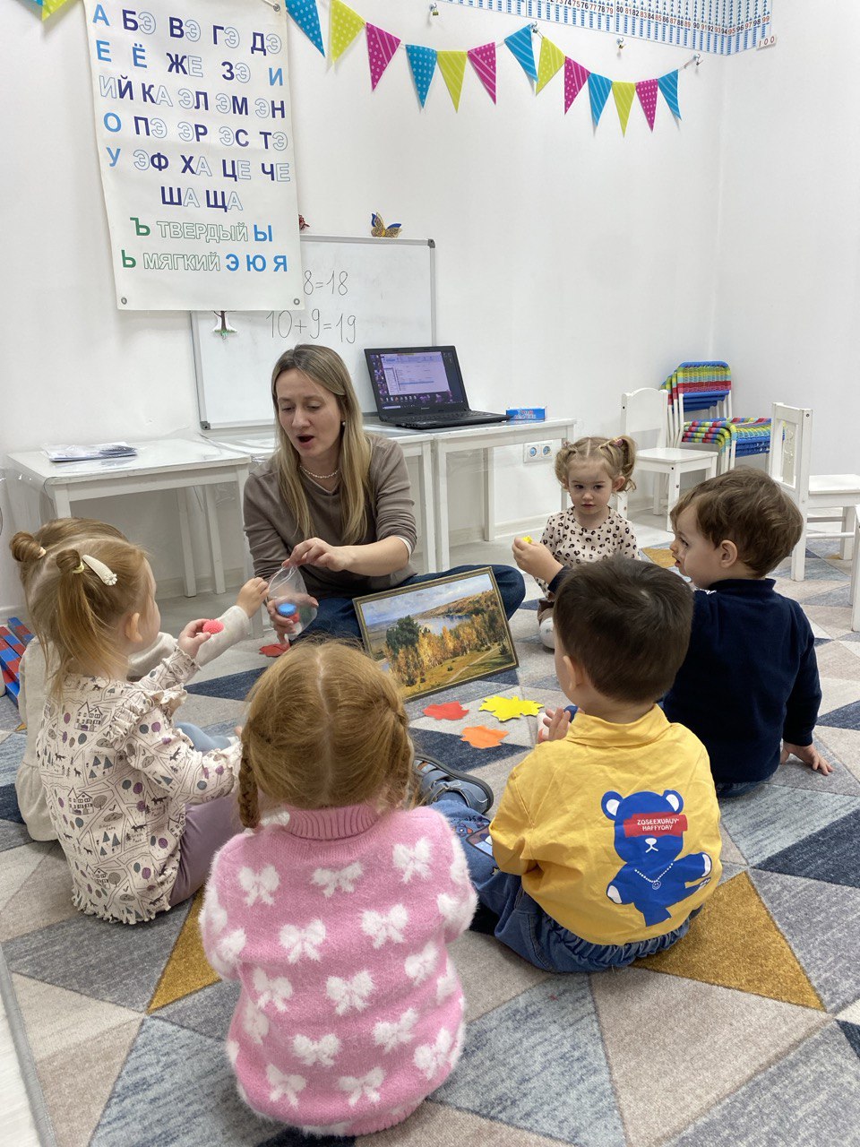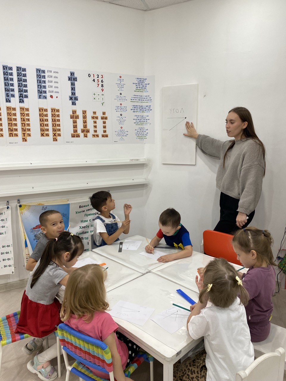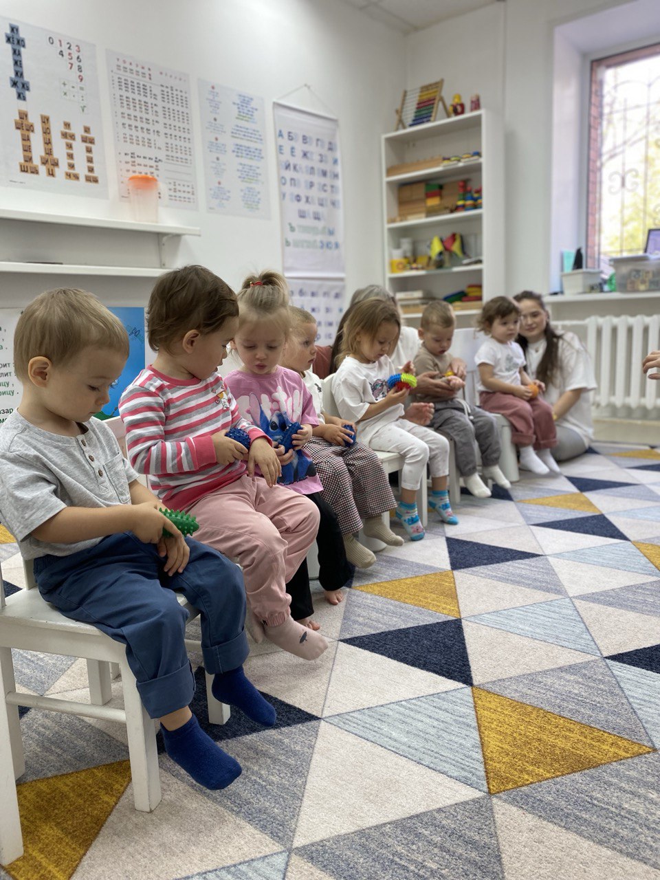 На занятиях дети знакомятся с буквами и цифрами, пропевают алфавит по Зайцеву, ведут пересчет по числовой ленте.
